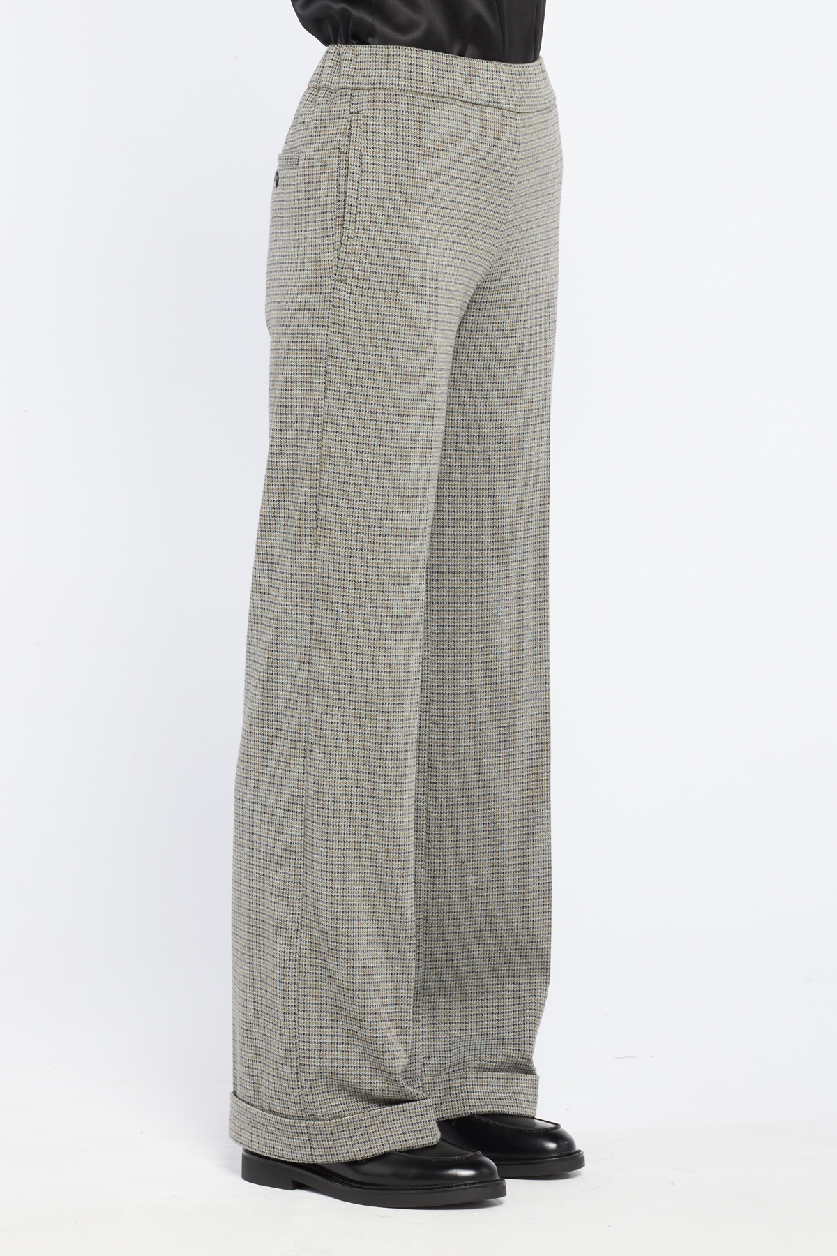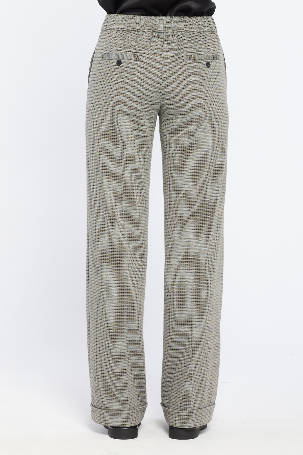 Pantalone dritto con elastico in vita, con finta tasca a filetto nel fianco e dietro.